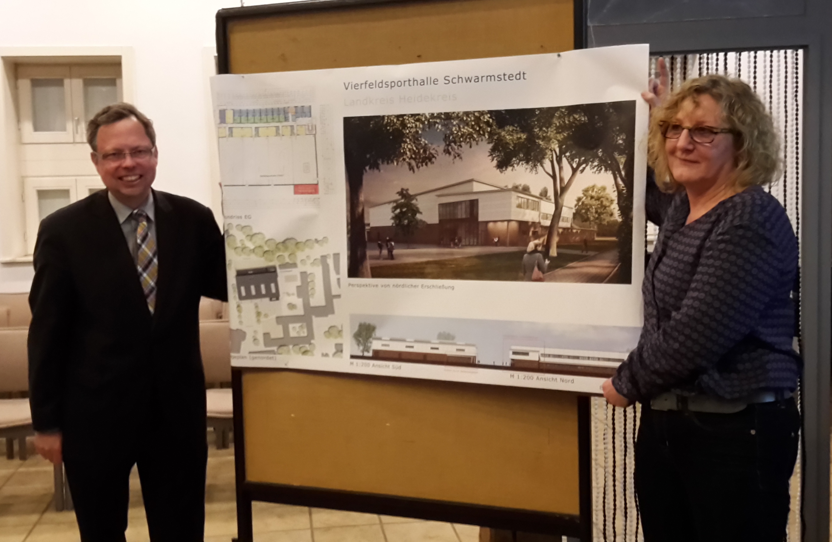 Zum Foto: Marlies Abels (Heidekreis) und Björn Gehrs (Samtgemeinde) freuen sich auf die neue Vier-Feld-Sporthalle.