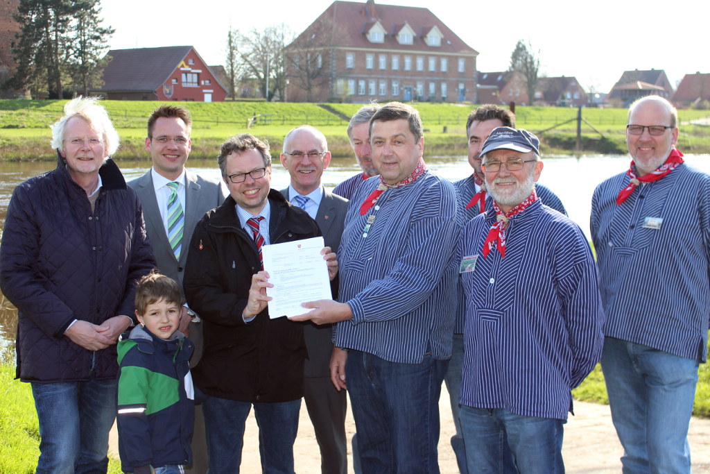 Foto: Siegfried Dierken (Amt für regionale Landesentwicklung), Alexander von Seggern (Bürgermeister Gemeinde Dörverden) LAG-Vorsitzender Björn Gehrs (Bürgermeis-ter Samtgemeinde Schwarmstedt) mit Sohn Jan, Wolfgang Rodewald (Bürgermeister Gemeinde Kirchlinteln) sowie die Fährleute Rolf Homann, Günter Lühning, Jens Brettschneider, Karlheinz Bruns und Dietrich Kerwat (von links) bei der Übergabe des 1. Bewilligungsbescheides im Aller-Leine-Tal in der Förderperiode 2014-2020