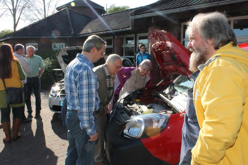 Sobald die Motorhauben wieder zugeklappt waren, begrüßten Karl Gerhard Tamke, Bürgermeister der Gemeinde Hodenhagen, und Tanja Frahm vom Regionalmanagement für die Region Aller-Leine-Tal die mit viel Energie angereisten Akteure. Nach einer kurzen Einführung zum EU-Förderprogramm LEADER im Aller-Leine-Tal, erläuterte Cort-Brün Voige, Bürgermeister der Samtgemeinde Rethem (Aller), dass die Energiewende nur gemeinsam mit den Bürgerinnen und Bürgern vor Ort erreicht werden kann. Sein Aufruf an die Teilnehmerinnen und Teilnehmer lautete: "Machen Sie mit beim Energienetzwerk EwALT (Energiewende im Aller-Leine-Tal), dem Nachfolger der nun seit 20 Jahren aktiven Projektgruppe Erneuerbare Energien."