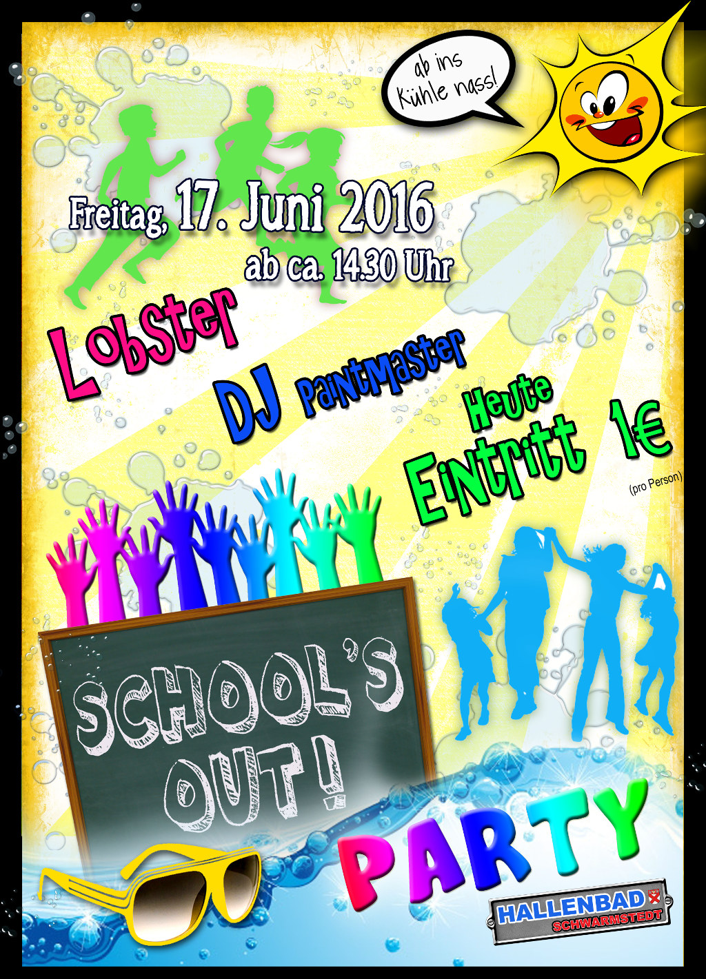 Anlässlich der bevorstehenden Sommerferien und der damit verbundenen Schließzeiten des Hallenbades Schwarmstedt in der Zeit vom 27.06. bis 07.08.2016 lädt die Samtgemeinde Schwarmstedt zu einer School´s out Party für Freitag, den 17. Juni 2016, ab 14.30 Uhr, in das Hallenbad ein.