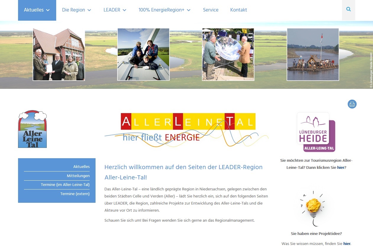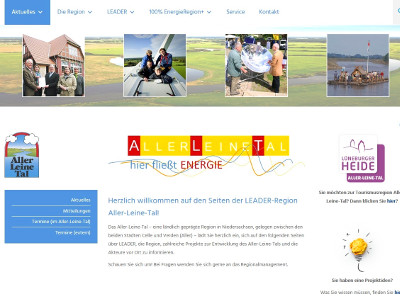 Mit einem energiegeladenen Design informiert die neue Internetpräsenz alle LEADER- und ENERGIE-Interessierten rund um die regionale Entwicklung im ländlich geprägten Aller-Leine-Tal. Auf der Website stellt sich die Region vor und gibt einen Einblick in die Projekte, die seit den 1990er Jahren umgesetzt wurden und in der aktuellen Förderperiode seit 2014 von der LAG positiv beschlossen wurden. Auch die drei neuen LEADER-Projekte, die die LAG in ihrer Sitzung am 16. März auf den Weg gebracht hat, sind hier zu finden: "allerenergie – Das E-Dorfauto für das Aller-Leine-Tal", eine "Studie zur Elektromobilität in der Region Lüneburg" und eine "Zeitgeschichtliche Werkstatt im Kapitelhaus Wittlohe".