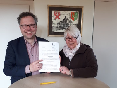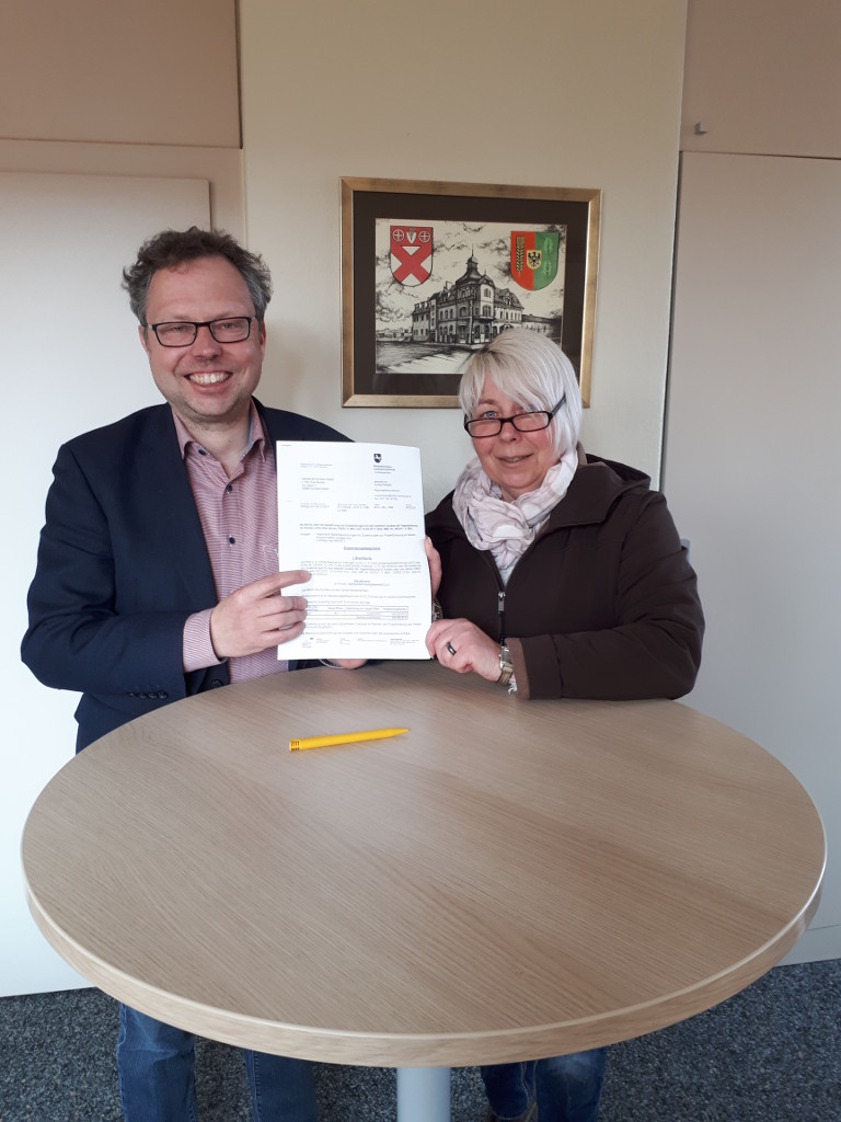 Zum Foto: Freude über den Zuwendungsbescheid und eine Förderung in Höhe von 540.000 Euro. v.l. Gemeindedirektor Björn Gehrs und Bürgermeisterin Claudia Schiesgeries.