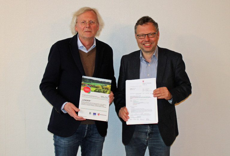 Foto: Freuen sich über die Bewilligung für Schwarmstedt.: Siegfried Dierken (Amt für regionale Landesentwicklung, Dezernatsteilleiter Geschäftsstelle Verden, links), Björn Gehrs (Samtgemeindebürgermeister und Gemeindedirektor der Gemeinde Schwarmstedt, rechts)
