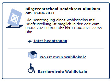 Link: Bekanntmachung über das Recht auf Einsicht in das Abstimmungsverzeichnis und die Erteilung von Stimmscheinen für den Bürgerentscheid Heidekreis-Klinikum am 18.04.2021