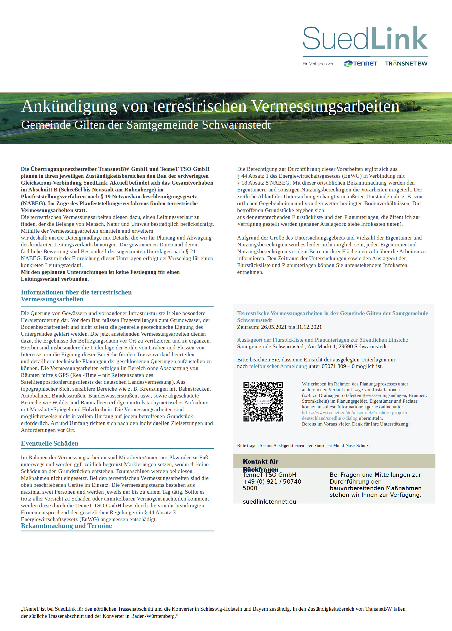 Die Übertragungsnetzbetreiber TenneT TSO GmbH und TransnetBW GmbH planen in ihren jeweiligen Zuständigkeitsbereichen den Bau der erdverlegten Gleichstrom-Verbindung SuedLink. Aktuell befindet sich SuedLink im Abschnitt B (Scheeßel bis Bad Gandersheim/Seesen) im Planfeststellungsverfahren nach § 19 Netzausbaubeschleunigungsgesetz (NABEG). Im Zuge des Planfeststellungsverfahrens finden innerhalb und außerhalb des von der Bundesnetzagentur bereits festgelegten 1.000 m breiten Korridors Kartierungsarbeiten auf möglichen Logistikflächen, Zwischenlagern und Zuwegungen in der Bauphase von SuedLink statt.