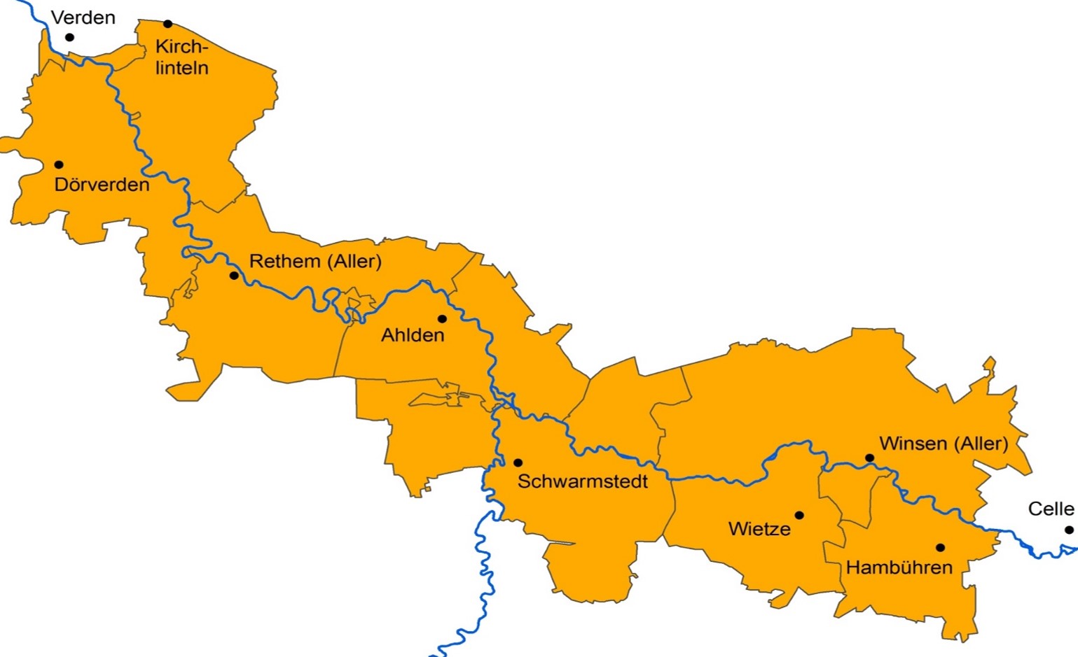 Hintergrund: LEADER im Aller-Leine-Tal Die LEADER-Region Aller-Leine-Tal möchte an die positiven Entwicklungen der letzten Jahre und die gute, gemeinsame Zusammenarbeit anknüpfen. Um weitere Gelder für innovative Projekte zu erhalten, möchte sich die Region für die kommende EU-Förderperiode 2023 bis 2027 erneut bewerben. Das REK muss bis zum 30.04.2022 fertig gestellt und eingereicht sein. Nicht nur die acht (Samt-)Gemeinden des Aller-Leine-Tals sind gefragt, sich aktiv am Prozess zu beteiligen, sondern insbesondere die Menschen vor Ort. Das Aller-Leine-Tal besteht aus den (Samt-)Gemeinden Ahlden, Rethem/Aller und Schwarmstedt (Landkreis Heidekreis), Hambühren, Wietze und Winsen/Aller (Landkreis Celle) sowie Dörverden und Kirchlinteln (Landkreis Verden) und der Ortschaft Eitze (Stadt Verden). |