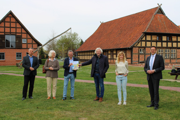 Aller-Leine-Tal. Am 29. April überreichte die Lokale Aktionsgruppe (LAG) Aller-Leine-Tal das regionale Entwicklungskonzept (REK) für die EU-Förderperiode 2023-2027 dem Amt für regionale Landesentwicklung Lüneburg, Geschäftsstelle Verden. Vorsitzender der Lokalen Aktionsgruppe und Samtgemeinde-Bürgermeister Björn Gehrs (Samtgemeinde Schwarmstedt), Bürgermeister Alexander von Seggern (Gemeinde Dörverden) und Samtgemeinde-Bürgermeister Björn Symank (Samtgemeinde Rethem (Aller)) sowie das LAG-Mitglied Ulrike Rusack aus der Gemeinde Kirchlinteln freuten sich, dass die Übergabe vor dem durch LEADER-Mitteln geförderten Kulturgut Ehmken Hoff in Dörverden stattfand.