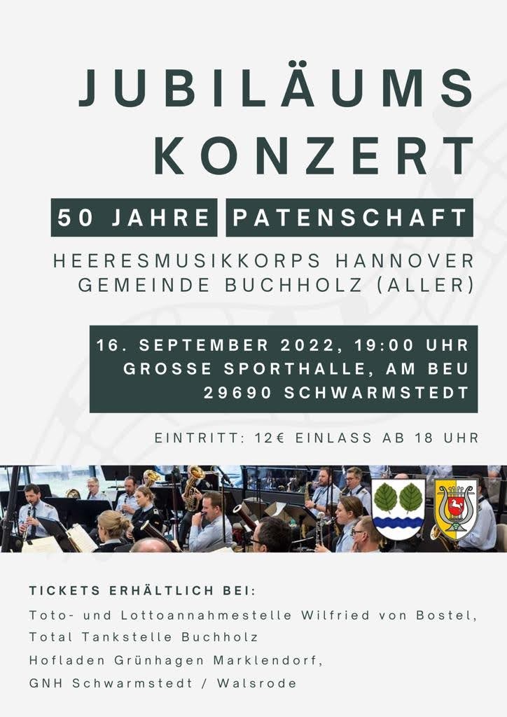 Gefeiert wird die 50 jährige Patenschaft zwischen der Gemeinde Buchholz (Aller) mit dem Heeresmusikkorp. Das Konzert in dieser Größenordnung ist etwas Besonderes und fand in dieser Form zuletzt 2006 in Schwarmstedt statt. Karten sind ab sofort für 12 Euro in Vorverkauf bei GNH und Lotto von Bostel in Schwarmstedt, der Total Tankstelle in Buchholz und Grünhagens Hofladen in Marklendorf erhältlich.