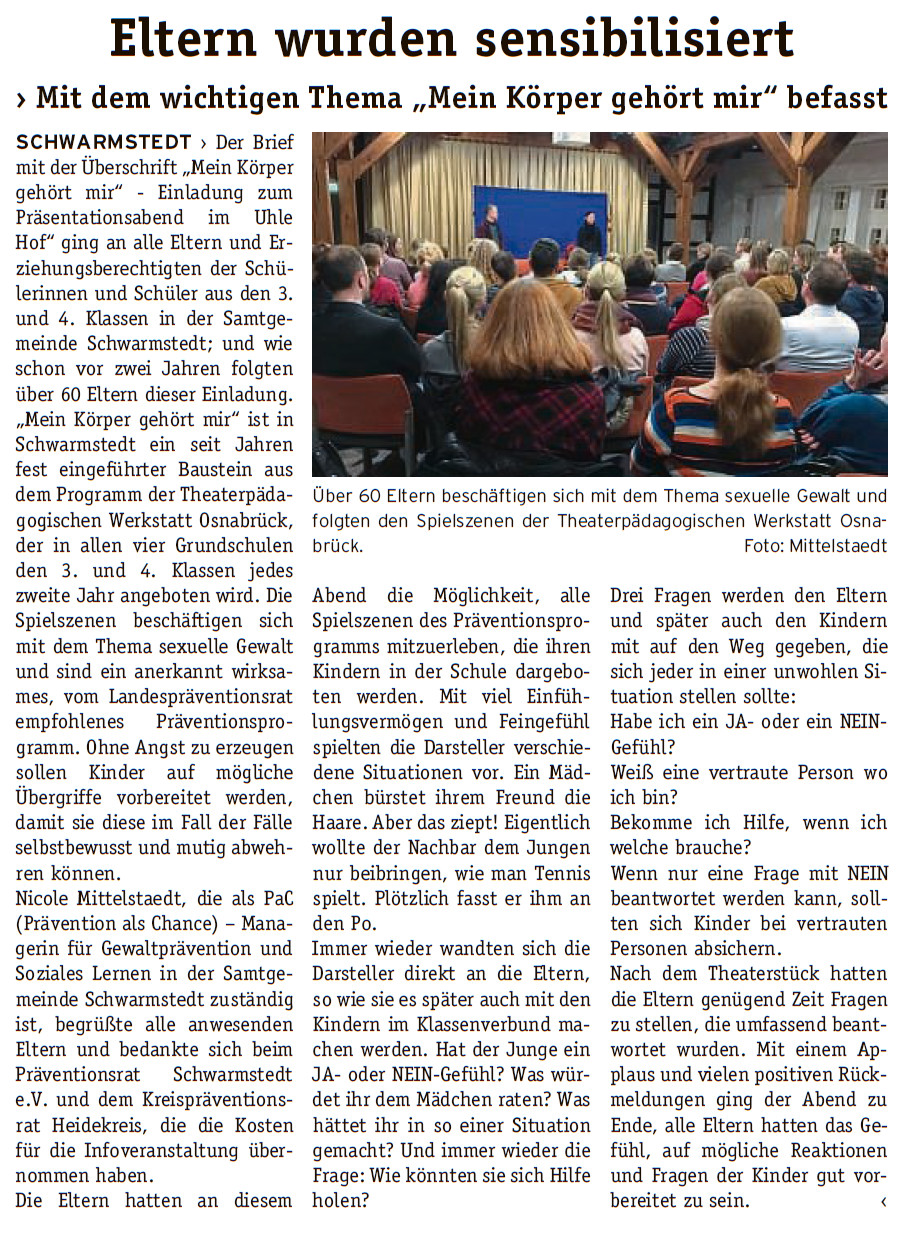 Der Brief mit der Überschrift „Mein Körper gehört mir“ - Einladung zum Präsentationsabend im Uhle Hof“ ging an alle Eltern und Erziehungsberechtigten der Schülerinnen und Schüler aus den 3. und 4. Klassen in der Samtgemeinde Schwarmstedt |