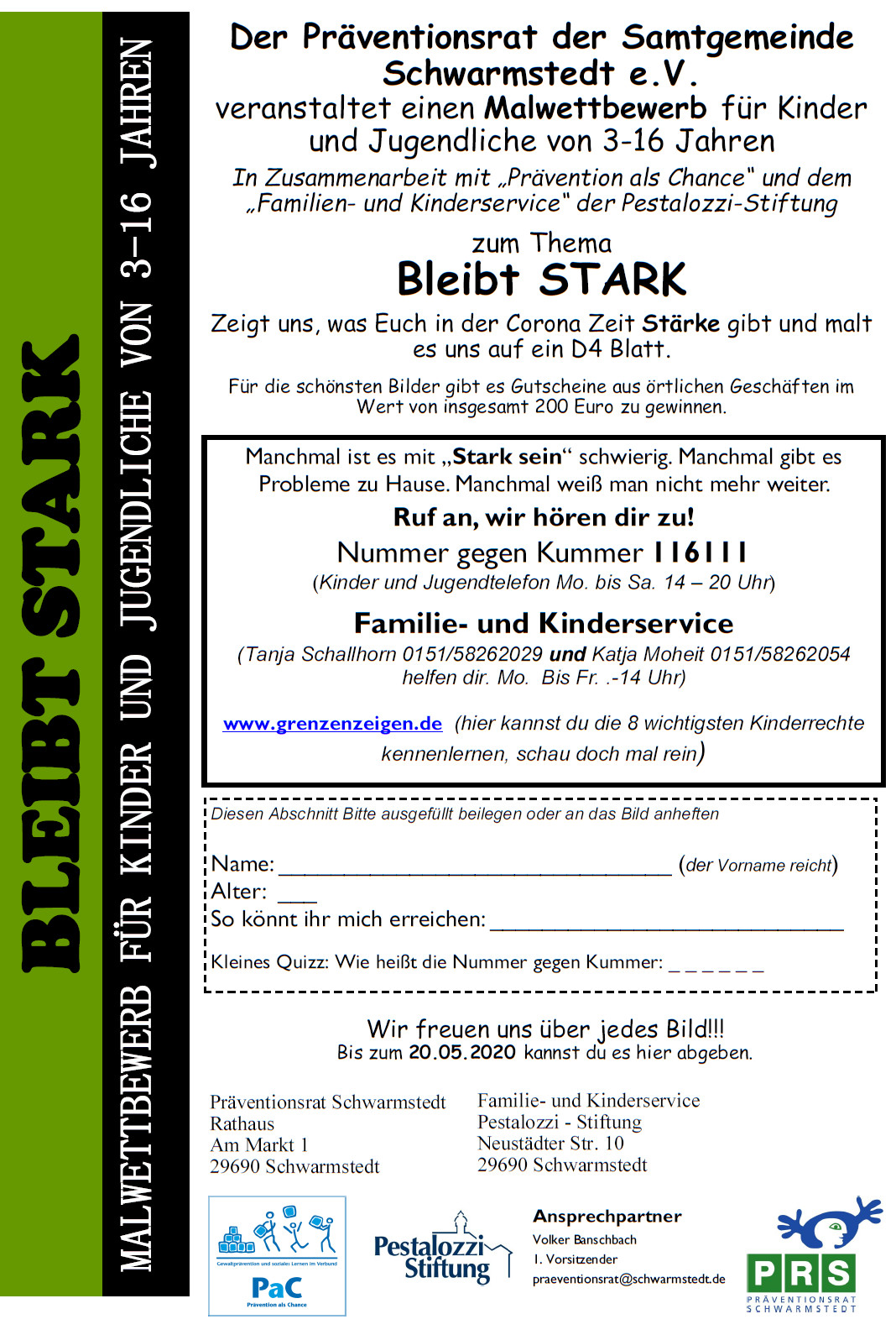 | Der Präventionsrat der Samtgemeinde Schwarmstedt e.V. veranstaltet einen Malwettbewerb für Kinder und Jugendliche von 3-16 Jahren In Zusammenarbeit mit „Prävention als Chance“ und dem „Familien- und Kinderservice“ der Pestalozzi-Stiftung zum Thema Bleibt STARK |
