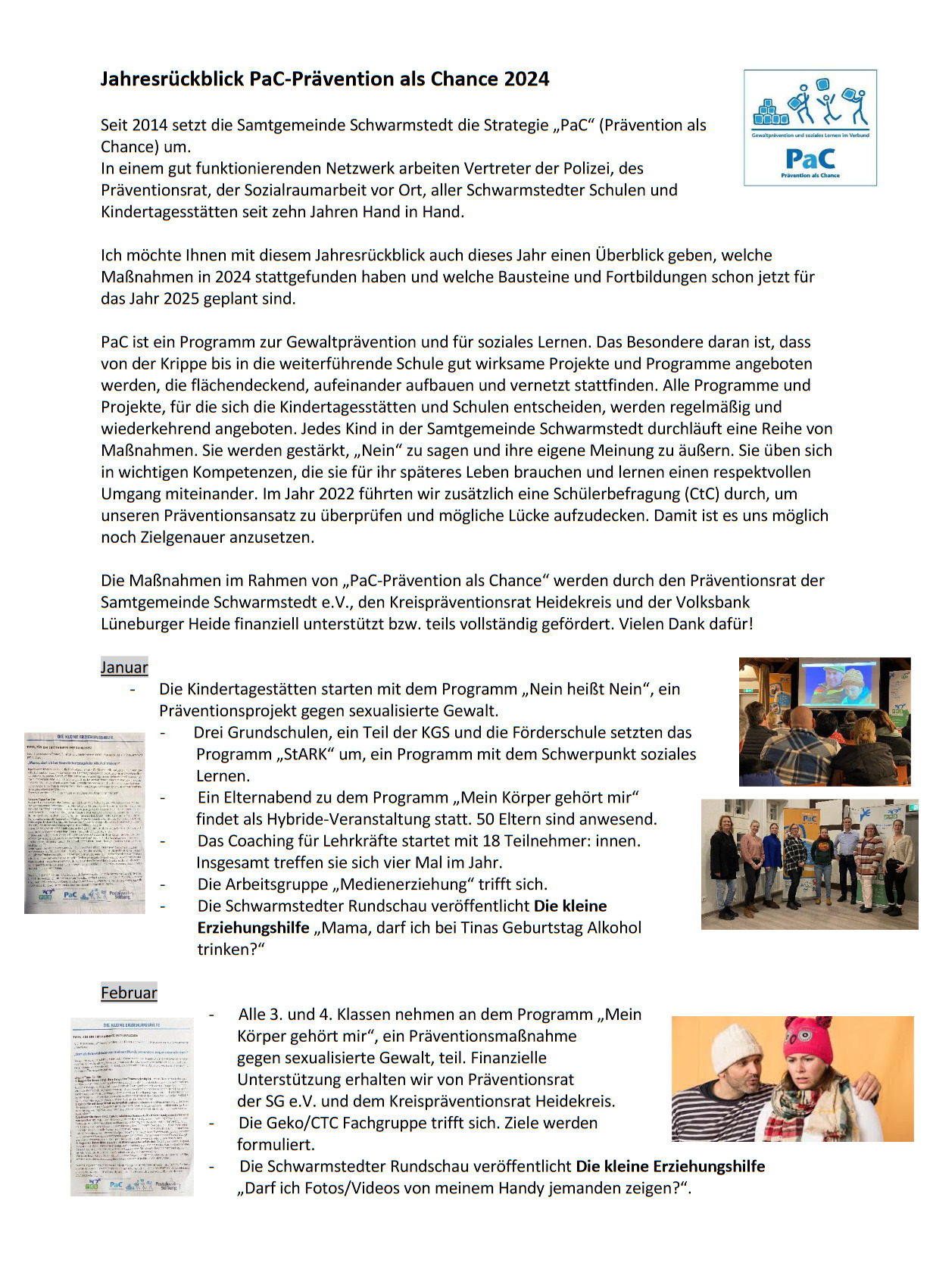 aktuell-2024-rueck Seit 2014 setzt die Samtgemeinde Schwarmstedt das Programm (die Strategie) „PaC“ (Prävention als Chance) um. In einem gut funktionierenden Netzwerk arbeiten Vertreter der Polizei, des Präventionsrat, der Pestalozzistiftung, aller Schwarmstedter Schulen und Kindertagesstätten seit zehn Jahren Hand in Hand.