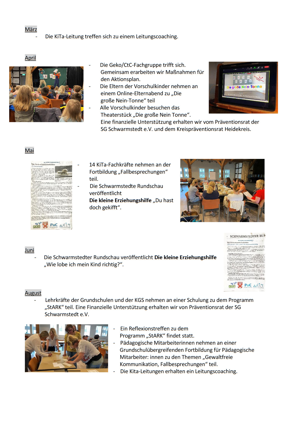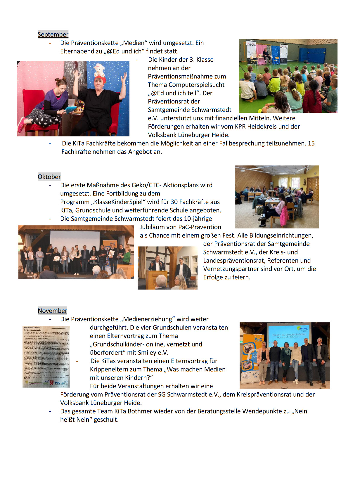 pac-aktuell-2024-11-zehn Prävention gab es seit Jahrzehnten in Schwarmstedt; immer einmal wieder, oft anlassbezogen und punktuell. Ein „Runder Tisch“ befasste sich dann schon systematischer mit Drogenproblematiken und Mitglieder holten die Ausstellung „ErLeben ohne Drogen“ des Landeskriminalamts und mehrere Go‐Sports‐Veranstaltungen in die Samtgemeinde.
