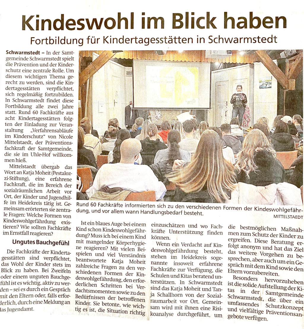 pac-aktuell-2025-03-rundschau In der Samtgemeinde Schwarmstedt spielt die Prävention und der Kinderschutz eine zentrale Rolle. Um diesem wichtigen Thema gerecht zu werden, sind die Kindertagesstätten verpflichtet, sich regelmäßig fortzubilden. In Schwarmstedt findet diese Fortbildung alle zwei Jahre statt. Rund 60 Fachkräfte aus acht Kindertagesstätten folgten der Einladung von Nicole Mittelstaedt, der Präventionsfachkraft der Samtgemeinde, die sie im Uhle-Hof willkommen hieß.